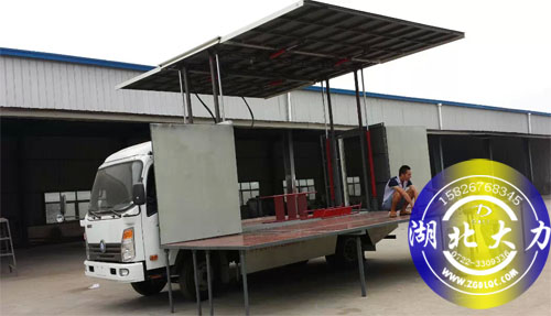 東風(fēng)小霸王流動(dòng)舞臺(tái)車頂部升起展開式,舞臺(tái)板由側(cè)面展開。
