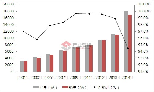 2001-2014年,我國冷藏車銷量持續(xù)穩(wěn)步增長,但是由于行業(yè)的發(fā)展還不成熟,企業(yè)對于冷藏車行業(yè)的發(fā)展一直持保守、觀望的態(tài)度,冷藏車的產(chǎn)銷率一直維持在95%以上。