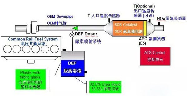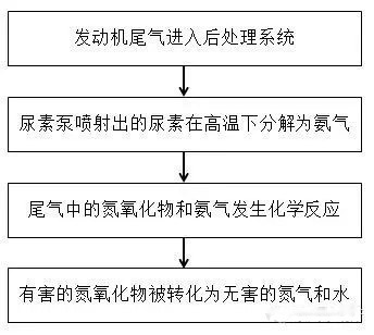 當(dāng)共軌系統(tǒng)噴射到燃燒室燃燒后產(chǎn)生的廢氣進(jìn)入排氣系統(tǒng),SCR利用尿素噴射系統(tǒng)將尿素水溶液噴入排氣系統(tǒng),在廢氣流中分解為氨氣并在催化劑的作用下與氮氧化物發(fā)生反應(yīng),使之轉(zhuǎn)化為無害的氮氣和水。系統(tǒng)還在尾氣排放前用氮氧化物傳感器檢測尾氣是否達(dá)到排放標(biāo)準(zhǔn)。由于SCR技術(shù)需要更高的發(fā)動機燃燒溫度,需在催化器前使用溫度傳感器。