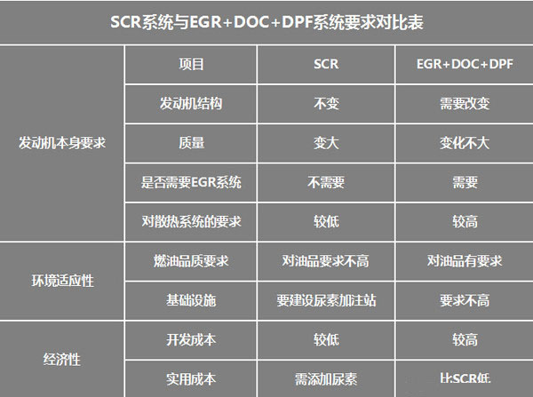 EGR+DOC+DPF的具有顆粒轉(zhuǎn)化率高,質(zhì)量輕,體積小的優(yōu)點,但對油品要求高,燃燒經(jīng)濟性要比SCR低,高發(fā)熱對冷卻系統(tǒng)有要求。