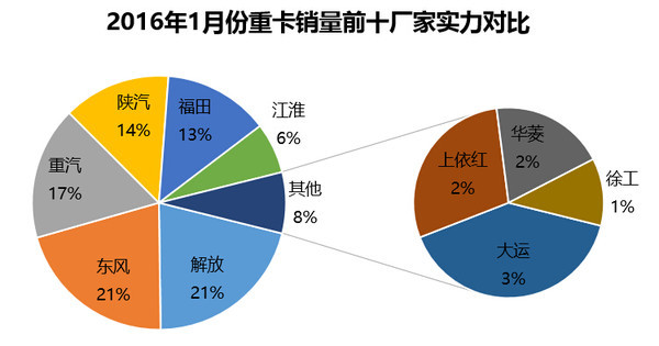1月份重卡銷量前十名依次為解放、東風、重汽、陜汽、福田、江淮、大運、上依紅、華菱、徐工。前十廠商銷量占去整個重卡市場97.65%的比例,強者越強的效應凸顯。其中,解放重卡銷量7526輛,同比上升72.14%,成為當月銷量冠軍。第二名東風銷量7478輛,同比下降23.46%;第三名重汽銷量6100輛,同比下降23.33%。