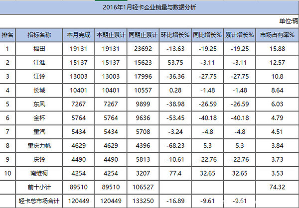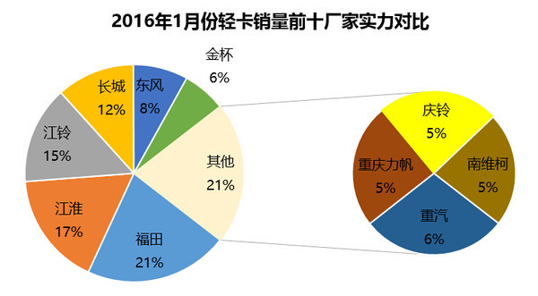 輕卡銷量前十廠商依次為福田、江淮、江鈴、長城、東風、金杯、重汽、力帆、慶鈴、南維柯。這十個廠商銷量占去74.32%的輕卡市場。其中前三位福田、江淮、江鈴合計占據(jù)39.25%的市場,近四成的市場占有率。