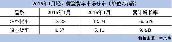 1月份輕卡銷量120449輛,同比下降9.61%;微卡銷量51129輛,同比增長9.44%。