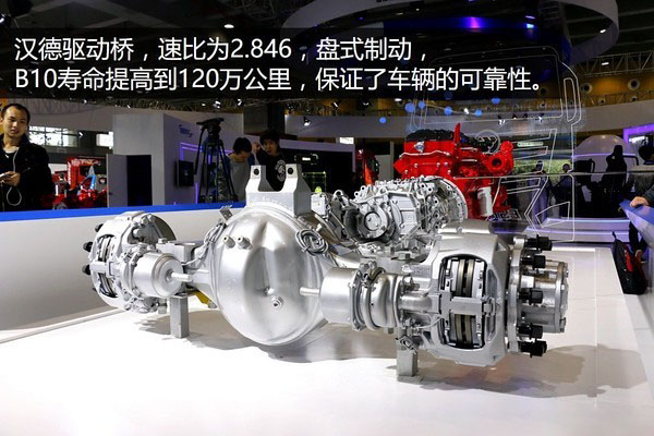 后橋?yàn)闈h德品牌驅(qū)動(dòng)橋,速比為2.846,制動(dòng)形式為盤(pán)式制動(dòng),剎車(chē)更加靈敏安全。另外該車(chē)的車(chē)橋B10壽命由60萬(wàn)公里提高到120萬(wàn)公里,保證了車(chē)輛的可靠性。