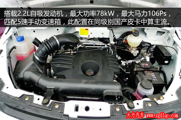 在傳動(dòng)系統(tǒng)方面,該車(chē)搭載了一臺(tái)2.2L自然吸氣發(fā)動(dòng)機(jī),最大功率可達(dá)78kW,最大馬力106Ps,傳動(dòng)系統(tǒng)均匹配5速手動(dòng)變速箱,這樣的配備在同級(jí)別國(guó)產(chǎn)皮卡中頗為主流。