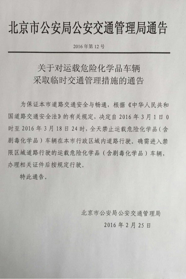 為確!皟蓵逼陂g交通秩序正常穩(wěn)定,保證城市道路交通安全與暢通,北京市決定于2016年3月1日0時至2016年3月18日24時,全天禁止運載危險化學(xué)品(含劇毒化學(xué)品)車輛資本是行政區(qū)域內(nèi)道路行駛,確需進(jìn)入禁限區(qū)域道路行駛的運載危險化學(xué)品(含劇毒化學(xué)品)車輛,辦理相關(guān)證件后按規(guī)定行駛。