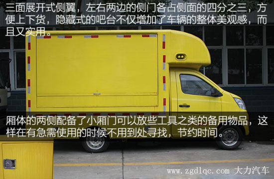 車身兩側(cè)還帶有隱藏式的吧臺,在售賣貨物的時(shí)候只需要將其向下拉即可使用,不僅方便而且還實(shí)用。在后輪的兩側(cè)增加了兩個(gè)工具箱,方便我們放些小東西,例如工具之類,這樣在遇到有需求的時(shí)候可以避免到處尋找。