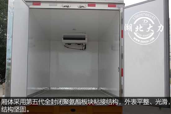 廂體厚度8厘米,內(nèi)外板材采用冷藏車專用玻璃鋼(可反射陽光),中間夾層為聚氨酯發(fā)泡隔熱材料(防火阻燃隔熱)真空復合三明治制板而成。底板為防滑鋁花紋板,廂內(nèi)帶有頂燈及防撞塊,設計貼心、用心。廂體后開門的門邊使用灰色膠條包邊處理,可以很好的防止冷氣外流。