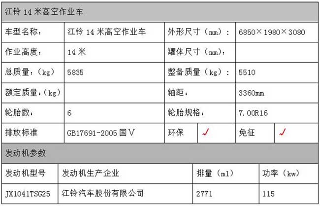 江鈴14米高空作業(yè)車詳細(xì)配置及參數(shù)說明 |