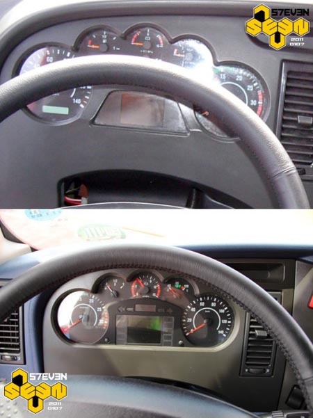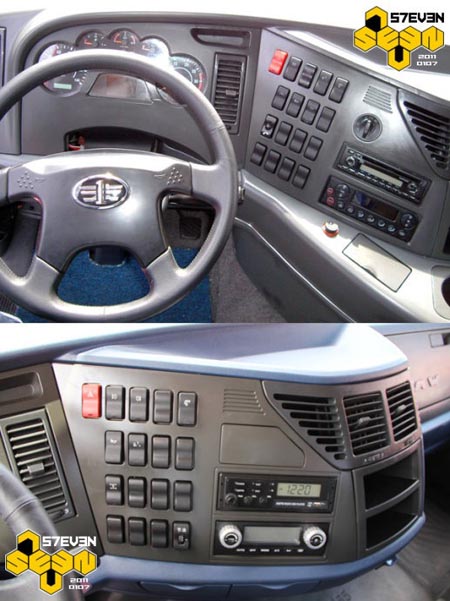 J6HC當(dāng)年的儀表臺(tái)是樣件,甚至沒有開皮紋。J6H采用與J6P一樣的儀表臺(tái),雖然套色的結(jié)構(gòu)拜托了中國重卡惡俗的仿桃木習(xí)慣,但藍(lán)灰的顏色搭配可能并不是最好的選擇吧。