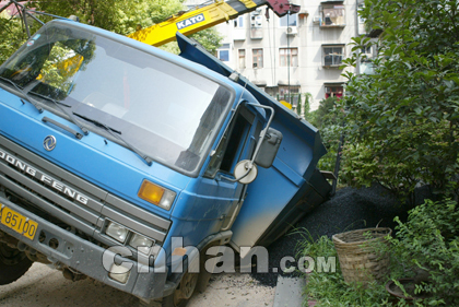 14時40分,記者趕到新村小學現(xiàn)場見到,一輛藍色瀝青車向左后側(cè)翻,車上的瀝青一半都撒在地上,被埋在里面的民工還沒有挖出來,一輛救援車試圖吊起側(cè)翻的瀝青車,但因起重力度不夠幾次未成,直到16時才將祝某的遺體拉出送到殯儀館。