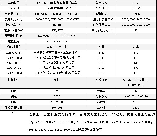 徐工單橋隨車起重運(yùn)輸車  底盤型號(hào):NXG1160D3ZAL1X 額定質(zhì)量:7200,7600,7400,7800