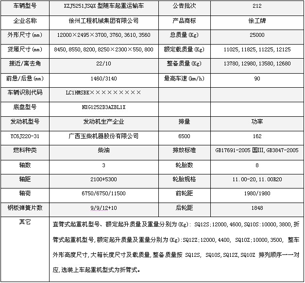 徐工小三軸隨車起重運(yùn)輸車  底盤型號(hào):NXG1252D3AZBL1X 額定質(zhì)量:11025,11825,11225,12125