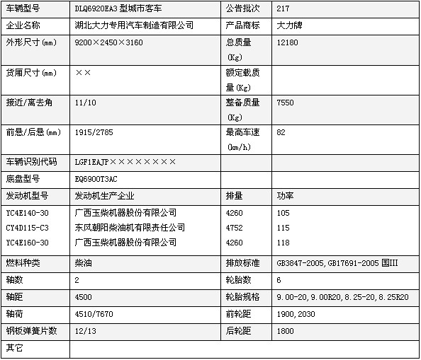 大力牌DLQ6920型城市客車技術(shù)參數(shù)