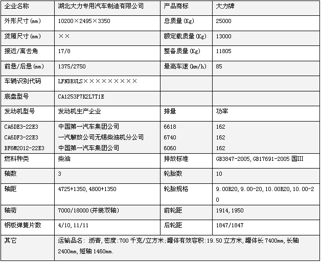 運(yùn)輸品名: 瀝青,密度:700千克/立方米;罐體有效容積:19.50立方米,罐體長7400mm,長軸2400mm,短軸1460mm.