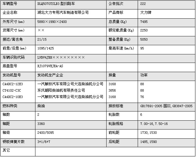 福田奧鈴掃路車  底盤型號:BJ1079VEJEA-AS 額定質(zhì)量:2250
