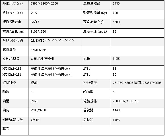 江淮掃路車  底盤型號:HFC1053K2T 額定質量:700