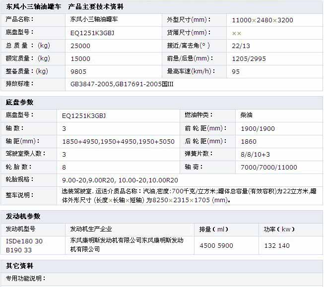 東風(fēng)小三軸加油車  底盤型號(hào):EQ1251K3GBJ 額定質(zhì)量:15000