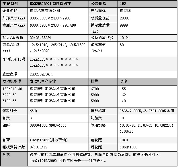 底盤:EQ3208GB3GJ1,發(fā)動(dòng)機(jī):SDe210 30 B220 30 B190 33
