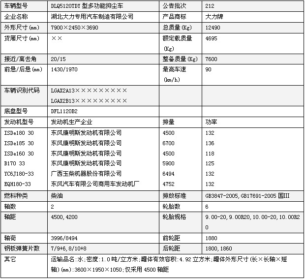 多功能抑塵車  底盤型號(hào):DFL1120B2 額定質(zhì)量:4695