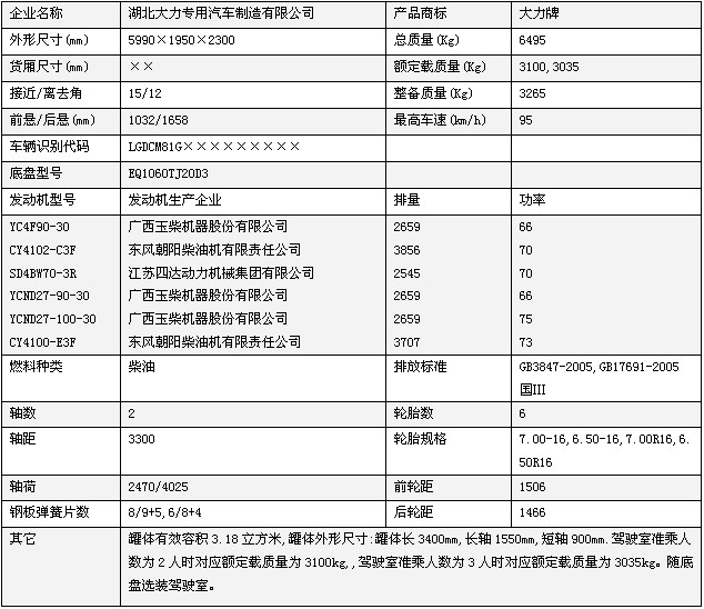 罐體有效容積:3.08立方米, 罐體外形尺寸 (長(zhǎng)×寬×高) (mm):3300×1500×930;駕駛室準(zhǔn)乘人數(shù)3人時(shí)載質(zhì)量為3000kg;隨底盤(pán)選裝駕駛室。
