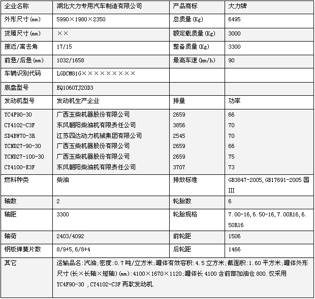 罐體有效容積:3.08立方米, 罐體外形尺寸 (長×寬×高) (mm):3300×1500×930;駕駛室準(zhǔn)乘人數(shù)3人時載質(zhì)量為3000kg;隨底盤選裝駕駛室。