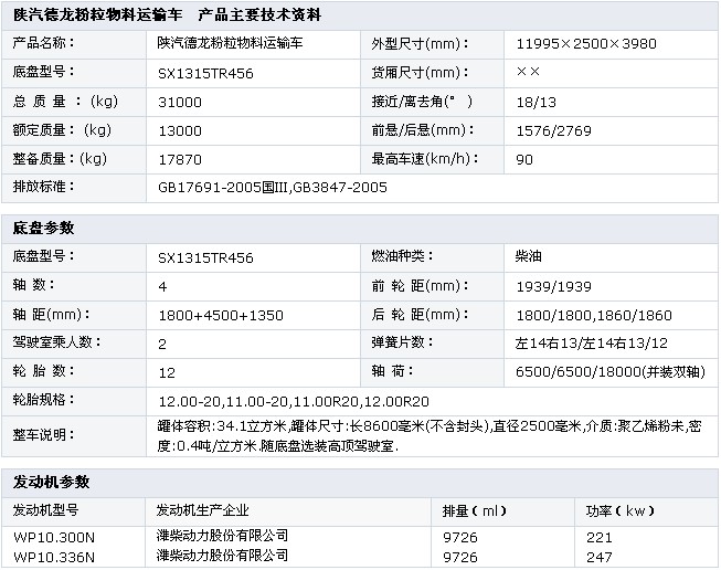 陜汽德龍粉粒物料運輸車  底盤型號:SX1315TR456 額定質(zhì)量:13000