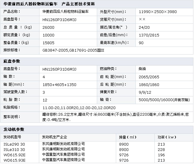 華菱前四后八粉粒物料運(yùn)輸車  底盤型號:HN1260P31D6M3J 額定質(zhì)量:10000
