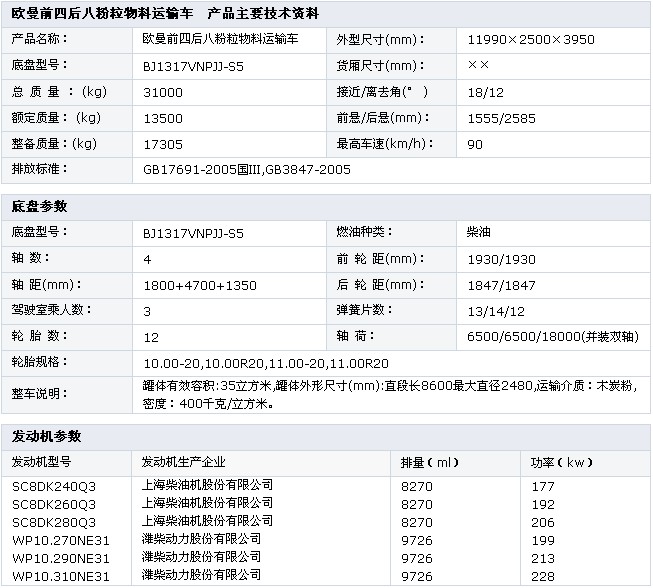 歐曼前四后八粉粒物料運輸車  底盤型號:BJ1317VNPJJ-S5 額定質量:13500