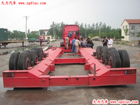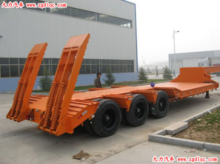 載貨部位的地板為平板結構且無欄板的半掛車,后三橋的凹梁結構也叫高低高,據(jù)說下圖中的這臺車重14噸,保拉100噸集中載荷,梁山某大廠出的。