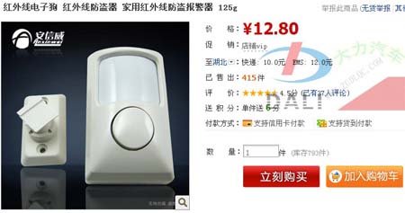小編測試的這個(gè)紅外報(bào)警器是在淘寶商城上買的,非常的便宜才12.8元,加上10快錢的郵費(fèi)也就20多塊。